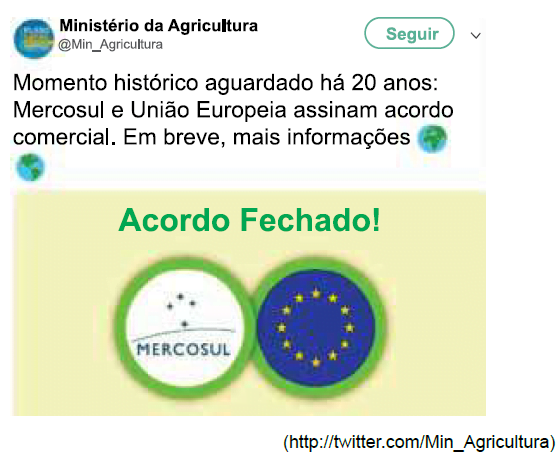 (Unifadra/2020 – Medicina) Leia o tuíte publicado pelo Ministério da Agricultura do Brasil em 28.06.2019.