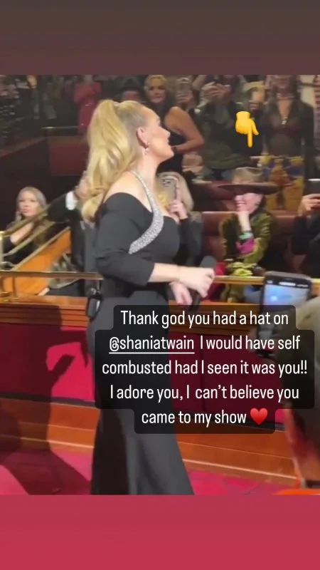 Via “stories” em seu Instagram, Adele postou um print do momento que passava bem na frente de Shania Twain, mas não se deu conta. ela escreveu: