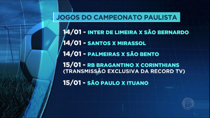 A FPF (Federação Paulista de Futebol) divulgou nesta quinta-feira (22) a tabela detalhada do Paulistão 2023, que será transmitido oficialmente pela Record TV. O campeonato começa no dia 14 de janeiro, um sábado, e a partida de abertura será às 11h entre Inter de Limeira e São Bernardo. No mesmo dia, às 18h30, Santos e Mirassol se enfrentam na Vila Belmiro, e às 20h30, o atual campeão Palmeiras enfrentará o São Bento. No domingo (15), às 186h00, o RB Bragantino joga contra o Corinthians em Bragança Paulista com transmissão da Record TV; às 18h30, São Paulo e Ituano se enfrentam no Morumbi.
