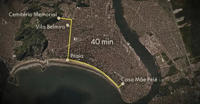 O corpo passou as últimas 24 horas na Vila Belmiro para o velório que recebeu mais de 78 mil pessoas e chegou ao fim nesta terça-feira (3). Em seguida, o corpo segue em cortejo pela Avenida Bernardino de Campos, o Canal 2, até a orla.