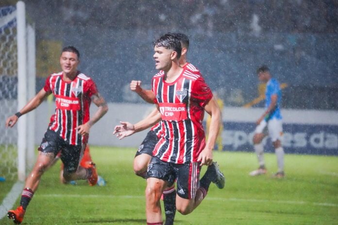 Com a vantagem numérica, o São Paulo abriu o placar. Após cruzamento da esquerda, o goleirão, desta vez, não conseguiu segurar e ofereceu um presente para Cauê, que, com o gol aberto, mandou para o fundo das redes.
