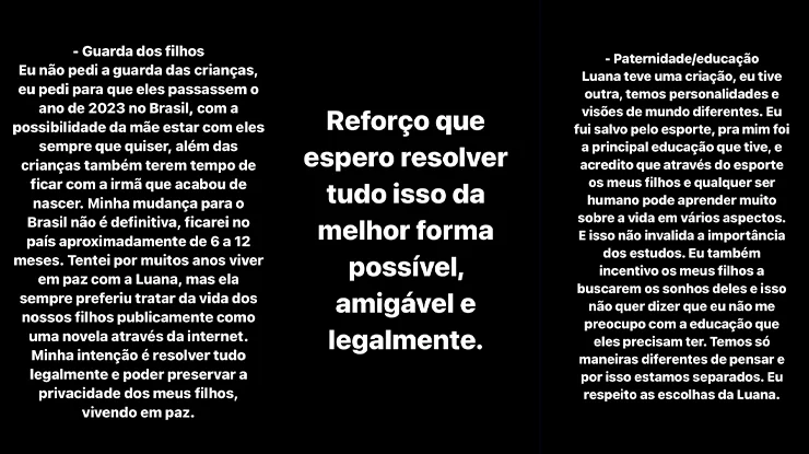 “Minha mudança para o Brasil não é definitiva, ficarei no país aproximadamente de 6 a 12 meses. Tentei por muitos anos viver em paz com a Luana, mas ela sempre preferiu tratar da vida dos nossos filhos publicamente como uma novela através da internet“, desabafou.