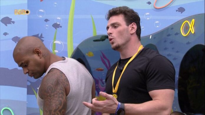 A primeira etapa da Prova do Líder desta quinta foi feita em grupos. Cowboy, Key, Cristian e Cézar jogaram juntos e conseguiram passar para próxima etapa, onde a disputa foi individual. No final, a competição ficou entre o enfermeiro e Gustavo, tendo o ‘agroboy’ levado a melhor. Mesmo com a derrota, o baiano acreditou que estaria no Vip do amigo, o que não aconteceu.