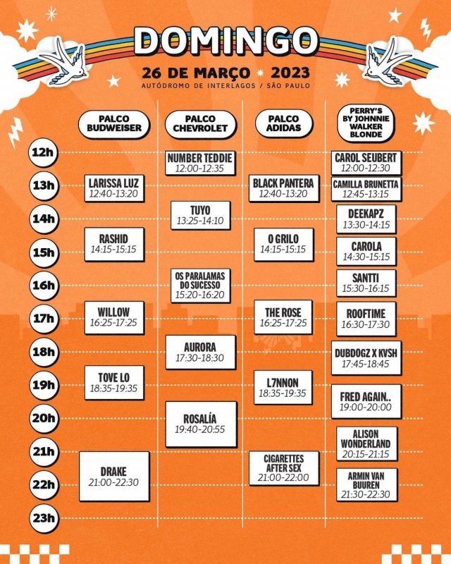 Drake, Rosalía, Cigarettes After Sex e Armin Van Buuren fecharão a 10ª edição do Lollapalooza Brasil da noite deste domingo (26). Os quatro são headliners dos quatro palcos dispostos no Autódromo de Interlagos, em São Paulo, e prometem brilhar no último dia de festival. Além deles, nomes como Tove Lo e o brasileiro L7NNON estão entre os destaques. Confira a programação completa a seguir: