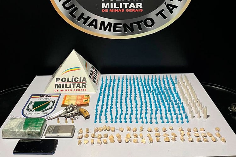 Com eles foram encontrados 326 pinos azuis de cocaína e 42 pinos brancos da mesma substância, 60 pedras de crack, uma barra de maconha, um revólver calibre 32 com três munições, R$ 40 e um celular. Os homens foram encaminhados à Delegacia de Plantão, junto com os materiais.