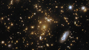 Esta foto tirada pelo Telescópio Espacial Hubble mostra um vasto aglomerado de galáxias, chamado de eMACS J1823.1+7822, licalizada a milhões de anos-luz da Terra. Ele é tão denso que causou uma curvatura no espaço-tempo, a ponto de distorcer outras galáxias que aparecem ao fundo