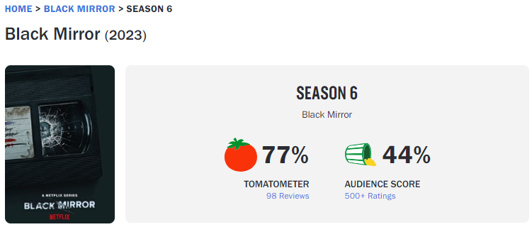 Já na opinião do público em geral, a mais recente leva de episódios da série da Netflix decepcionou mais do que agradou. No site Rotten Tomatoes, conhecido por agregar avaliações de filmes e programas de TV e gerar uma porcentagem de aprovação a partir de notas individuais, a taxa de avaliação da 6ª temporada de “Black Mirror” pela audiência está em 44%.