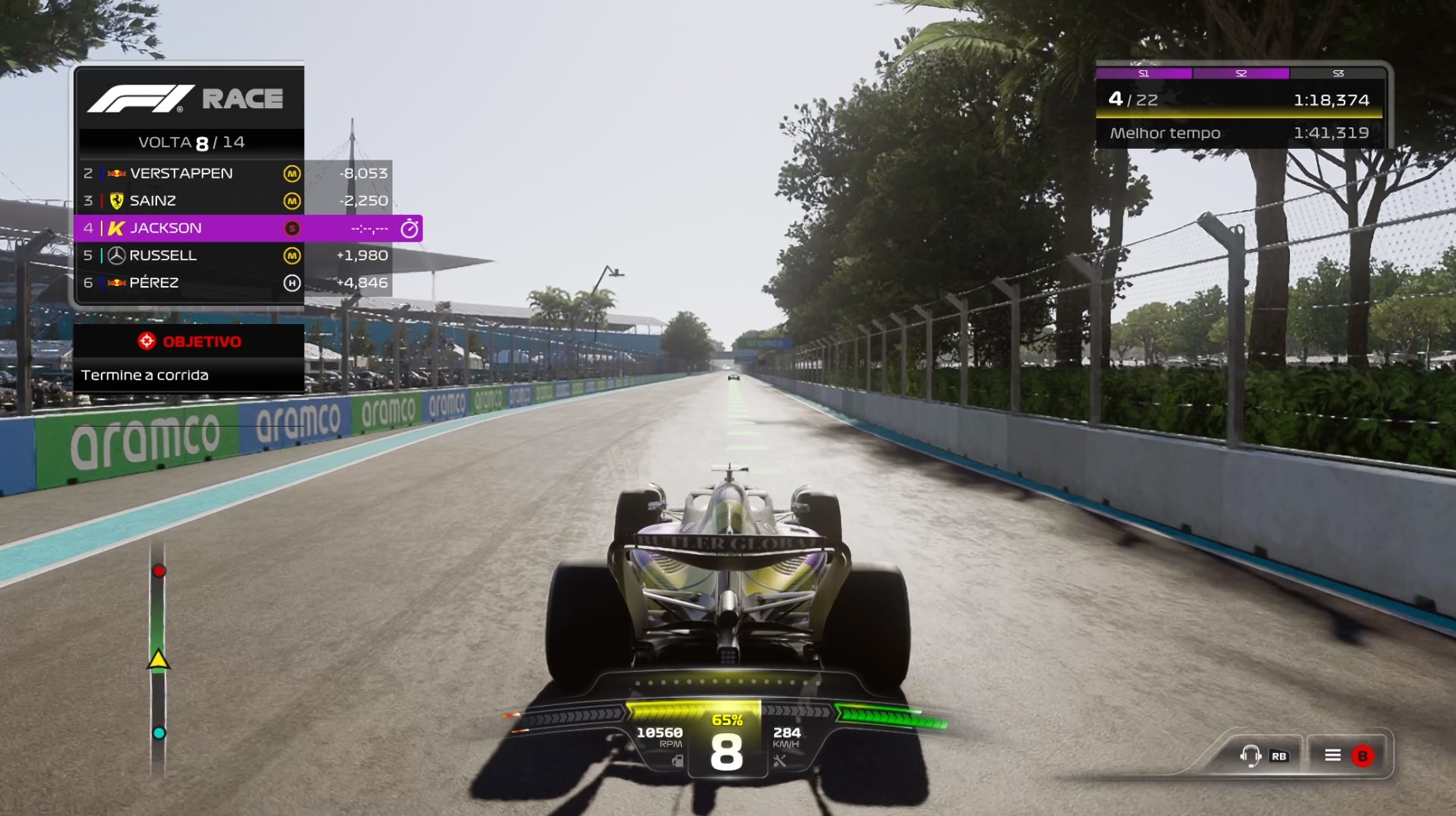 E esse realismo também aparece no decorrer da corrida em relação aos seus adversários. Foram muitos os momentos em que um carro precisou parar por um dano de colisão, ou até mesmo por problemas mecânicos. E o mais legal disso tudo é a maneira com que isso acontece, que é bem real, como por exemplo, no momento em que o carro de Charles Leclerc começou a “fumegar” na minha frente, e na volta seguinte, foi possível vê-lo encostado e abandonado em uma área de escape.