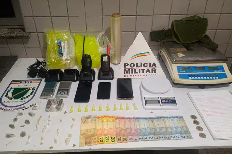 Durante as buscas no local, os policiais apreenderam 22 pedras de crack, dez pinos de cocaína, oito buchas de maconha, além de quatro balanças de precisão, dois rádios de comunicação, três celulares, quatro carregadores, R$ 154 e materiais para embalar entorpecentes.