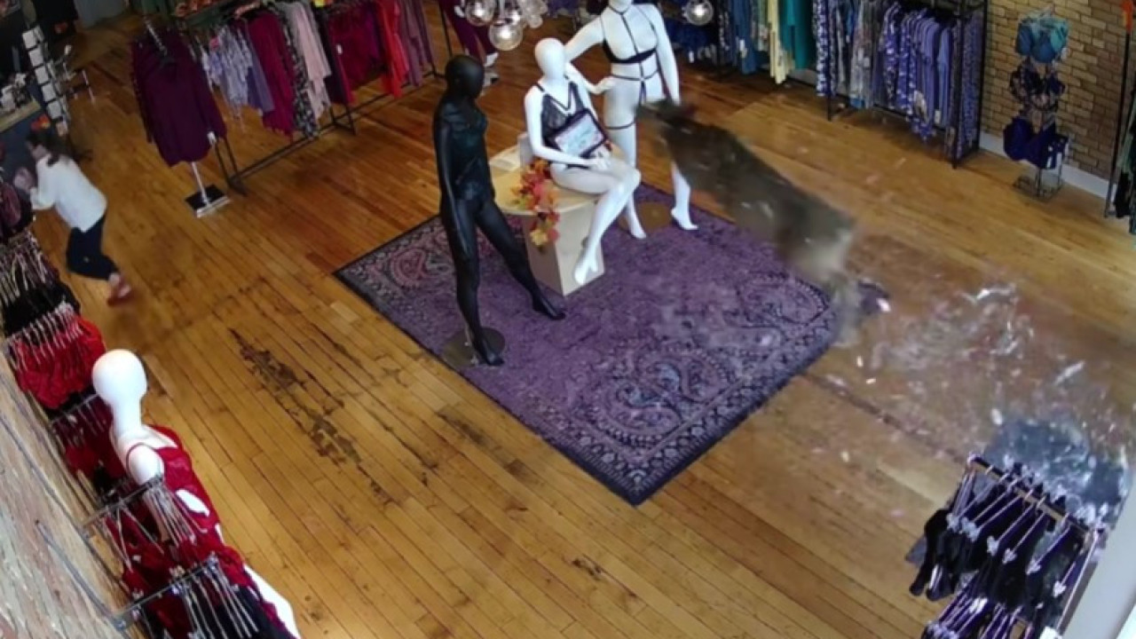 No vídeo, captado pelas câmeras de segurança da loja, é possível ver o animal entrando de rompante, partindo um manequim e derrubando algumas peças. Uma pessoa que estava na loja se desviou do animal a tempo.