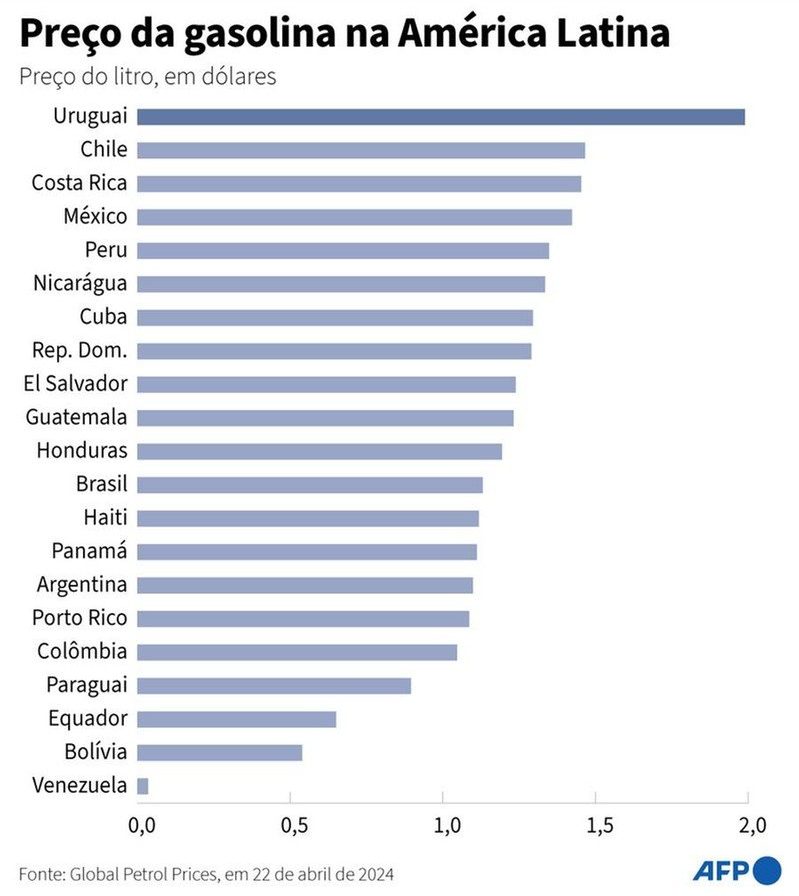 O Uruguai é disparado o país da América Latina com o litro da gasolina mais caro. Um levantamento feito pelo Global Petrol Prices, em 22 de abril de 2024, mostrou o preço em dólares do litro da gasolina em 21 países. O Brasil aparece na 12ª posição no período pesquisado.
