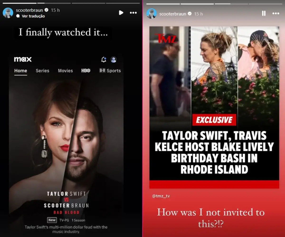 Primeiro, Braun compartilhou a capa de “Taylor Swift vs Scooter Braun: Bad Blood” e disse: “Finalmente assisti…”. Depois, ele achou que seria de bom tom fazer uma referência à festa de aniversário que Taylor e seu namorado, Travis Kelce, prepararam para a atriz Blake Lively no último domingo (250).