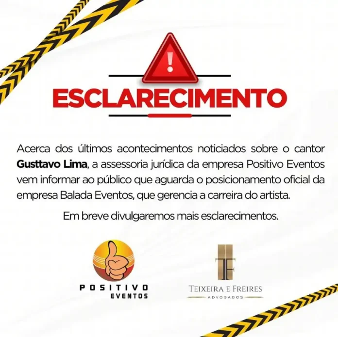 A Positivo Eventos, empresa responsável pelo show de Gusttavo Lima na cidade de Marabá, no Pará, emitiu um comunicado. O cantor está com apresentação marcada para esta sexta-feira (27) com ingressos esgotados, mas sua presença é incerta. Isso porque ele deixou o Brasil no começo da semana, horas antes de ter sua prisão decretada pelo Tribunal de Justiça de Pernambuco, e nenhuma informação sobre seu retorno foi divulgada até o momento.