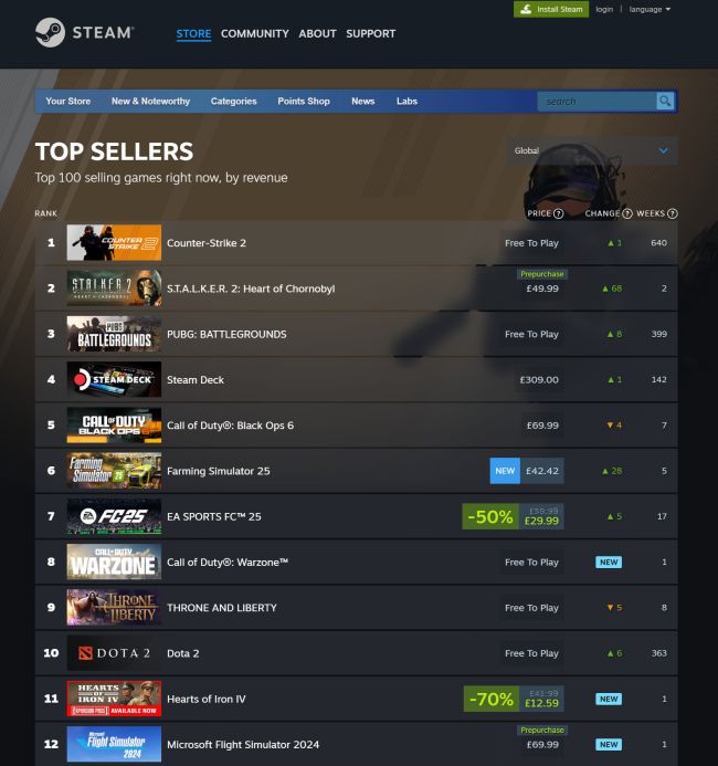 Como mostra o gráfico, também parece haver um grande interesse em Microsoft Flight Simulator 2024, que será lançado amanhã. Atualmente, é o número doze na parada de mais vendidos em Steam.