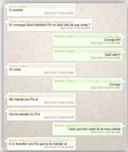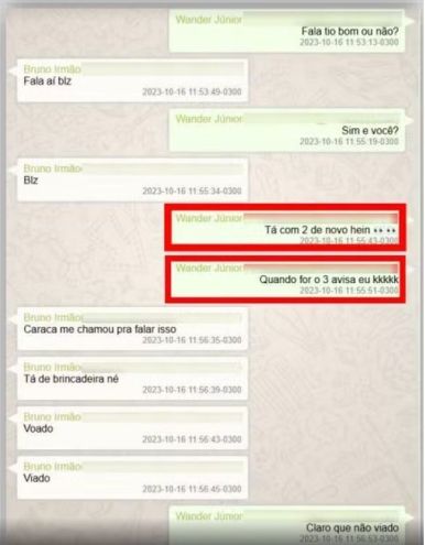 Prints de conversas por um aplicativo de mensagens fazem parte do processo que indiciou o jogador. 3.989 mensagens foram analisadas pela PF, dentre elas, uma conversa entre o camisa 27 do Rubro-Negro e o irmão, Wander Junior, onde eles negociam o jogo em que o atleta deve tomar um cartão amarelo.