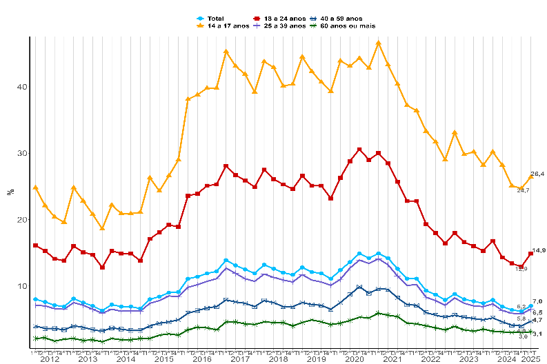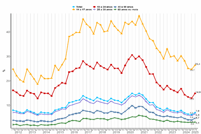 O Brasil registrou no primeiro trimestre de 2025 uma taxa de desemprego de 14,9% entre jovens com idade de 18 a 24 anos, um índice mais de duas vezes maior do que a média de 7% de desocupação no país. Na faixa entre 14 e 17 anos, a taxa é ainda maior: 26,4%. Os dados são do IBGE (Instituto Brasileiro de Geografia e Estatística).