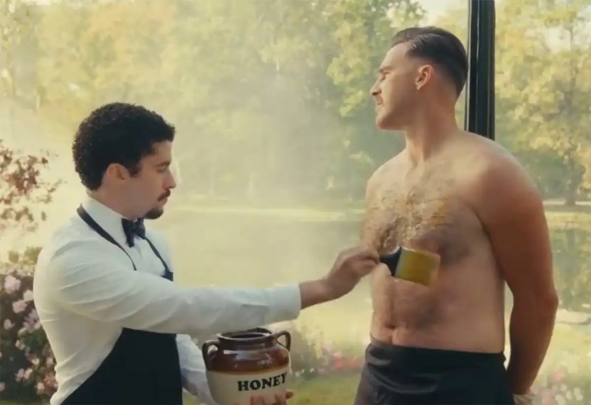 Um vídeo curioso se espalha pelas redes sociais nesta sexta (25/7): Bad Bunny passando mel no peito do jogador de futebol americano Travis Kelce, namorado de Taylor Swift. Os dois estão em um belo jardim, Travis está amarrado ao poste de luz, e Benito chega com roupa de garçom. Depois, aparece um urso em busca do mel.
